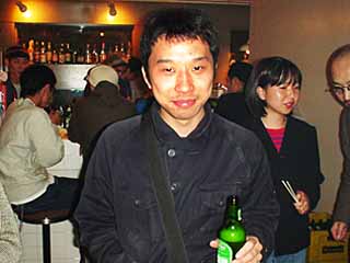 夜もふけ「京都系。」アーチストも続々来店。エキスポのヤマネくんと語らう、CRUIZIN' を主催する PAT Detective のヤタ社長(右)。この方をご存じないデザイナーはモグリだね。bambini レーベルにてのスウェーデンの恐るべき子供達ことガールフレンド全国来日ツアーを終えたばかりで虚脱状態。「ナホちゃんがいちばんショックを受けていて、毎晩、心に開いた穴ポコをお酒でうめている」とのウワサ。